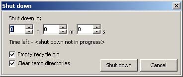 В предлагаемом окне пользователь может задать интервал времени, через который следуй произвести выключение компьютера, а также выставлением соответствующей галочки определить необходимость очистки корзины и временных директорий при выключении. Нажатие клавиши ESC (кнопки Cancel) при инициализированном таймере останавливает процесс.