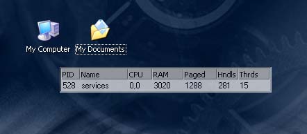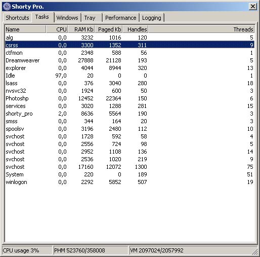 Закладка содержит список всех запущенных процессов с соответствующими аттрибутами. Контекстное меню позволяет убить процесс* **, запустить дебаггер, установить приоритет процесса или запустить отдельное окно с аттрибутами только этого процесса.